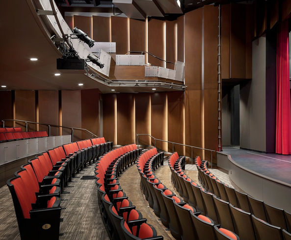 The Main Stage, a 250 seat proscenium theater with a digital audio system, a repertory light plot, and a projection system.
